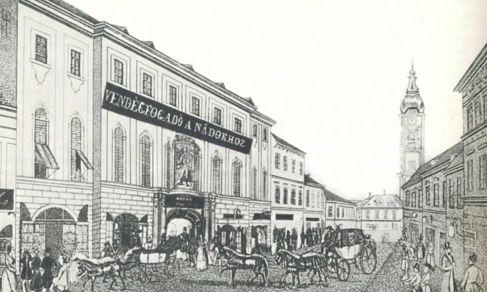 A képen a szálló homlokzatán József nádor életnagyságú képe. Jobbra a háttérben az akkor még csak egyemeletes Városháza.