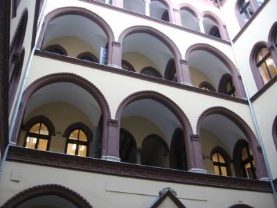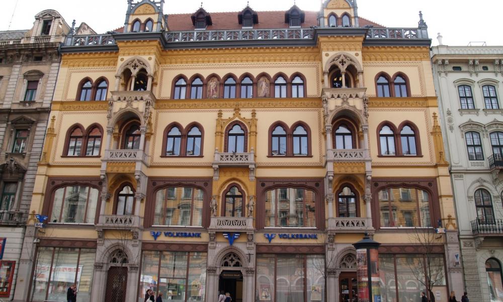 Az 1892-ben épült díszes bérházat Stern Károly megrendelésére Schmal Henrik tervezte (aki fiatalon kőművesből képezte magát végzettség nélküli építésszé, Magyarországra költözve segítette Yblt a Vámház tervezésénél, valamint munkái az Uránia mozi és a Párizsi Udvart körülvevő palota, de dolgozott az Operaház kivitelezésén is). Munkájában sikeresen ötvözte a velencei gótika és az itáliai reneszánsz formai elemeit az arab-mór építészet díszítésével. A ház homlokzatán két Lotz Károly freskó. Legújabban a Volksbank újította fel, a ház értékes elemeit (majolika és stukkó díszeket, ajtókat, rácsokat stb.) a felújítás előtt eltávolították és elraktározták, hogy amennyire csak lehet, az eredetit tehessék vissza az épületre.